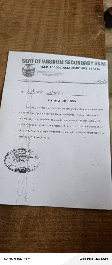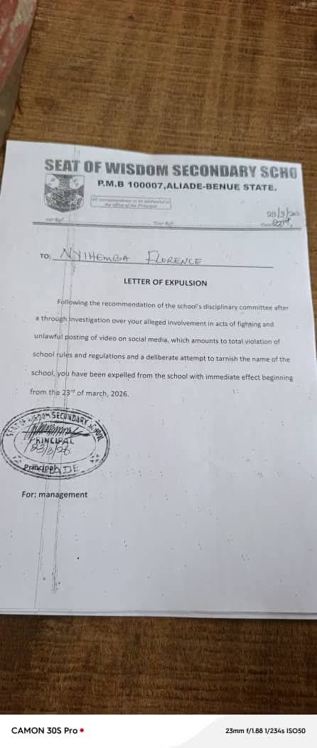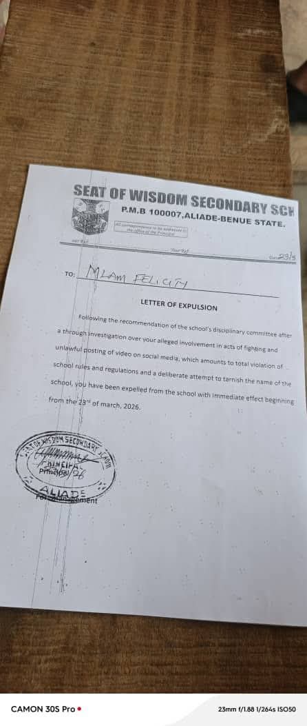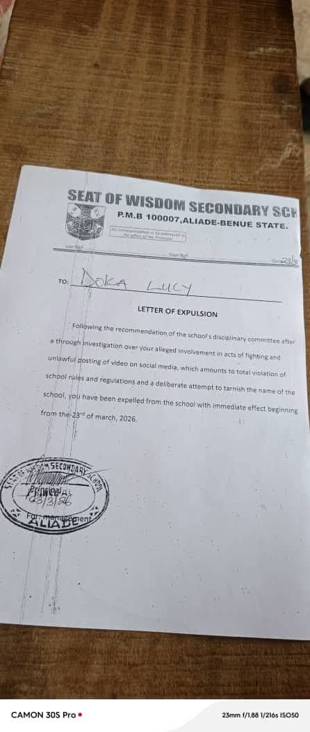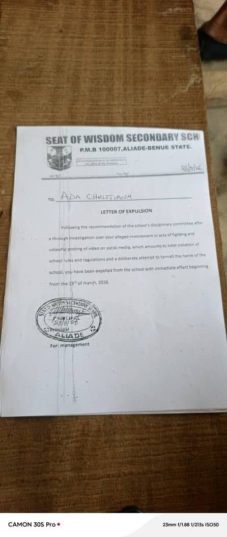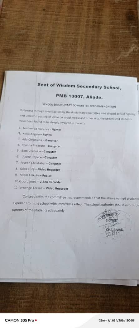A violent clash involving female students of Seat of Wisdom Secondary School, Aliade, Benue State, has triggered disciplinary action, with 11 students expelled after videos of the incident surfaced online.