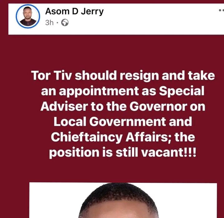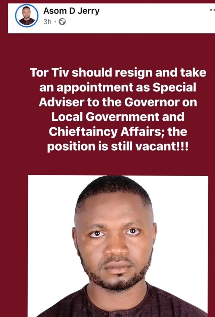 Jerry’s core grievance centers on a lingering administrative gap in the Benue State Government. Despite announcements and political maneuvering, the position of Adviser to the Governor on Local Government and Chieftaincy Affairs remains officially vacant. Critics like Jerry argue that the Tor Tiv, as a respected elder statesman with deep institutional knowledge, is uniquely qualified to fill the role and help stabilize traditional governance structures amid rising tensions over land, security, and local administration.