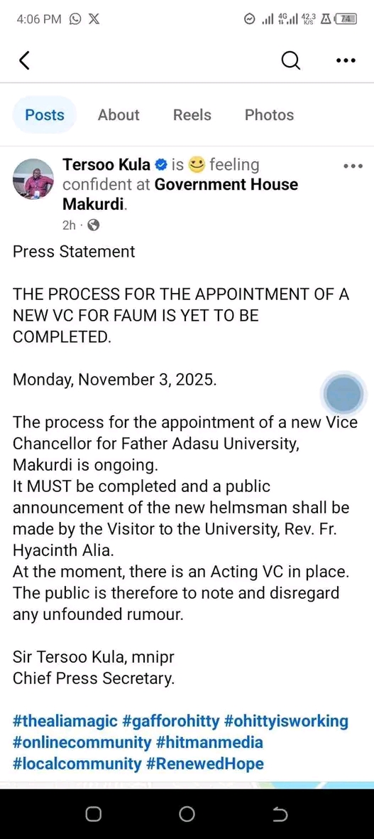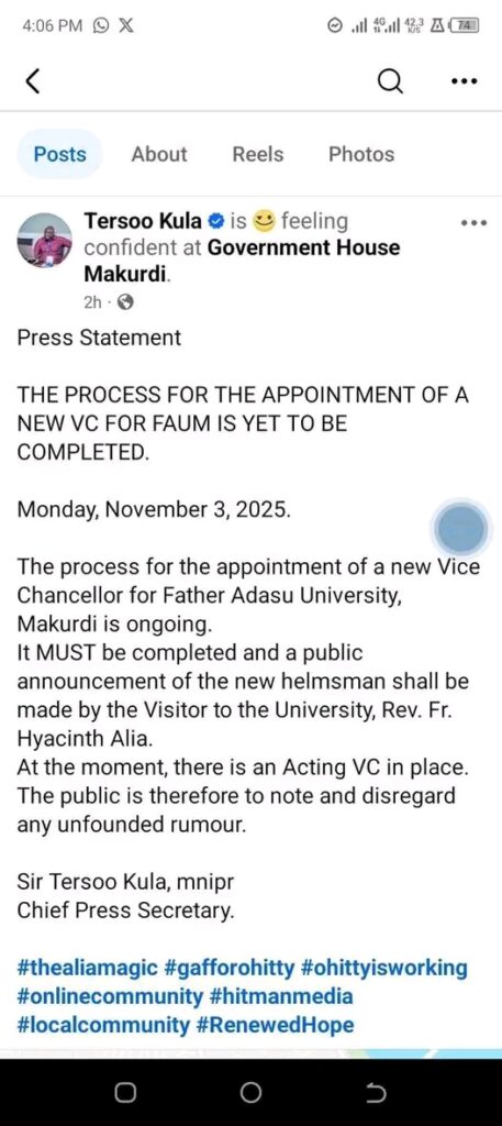 The statement takes direct aim at yesterday’s press release by Sir Tersoo Kula, the Governor’s Chief Press Secretary, which urged the public to disregard rumors of a completed appointment and affirmed that the process remains ongoing under an Acting VC. Adi dismissed Kula’s intervention as “perfunctory, obfuscatory, and unauthorized,” arguing that the Press Secretary holds no legitimate role in university governance and that the statement was a deliberate attempt to manipulate public perception and deflect scrutiny.
