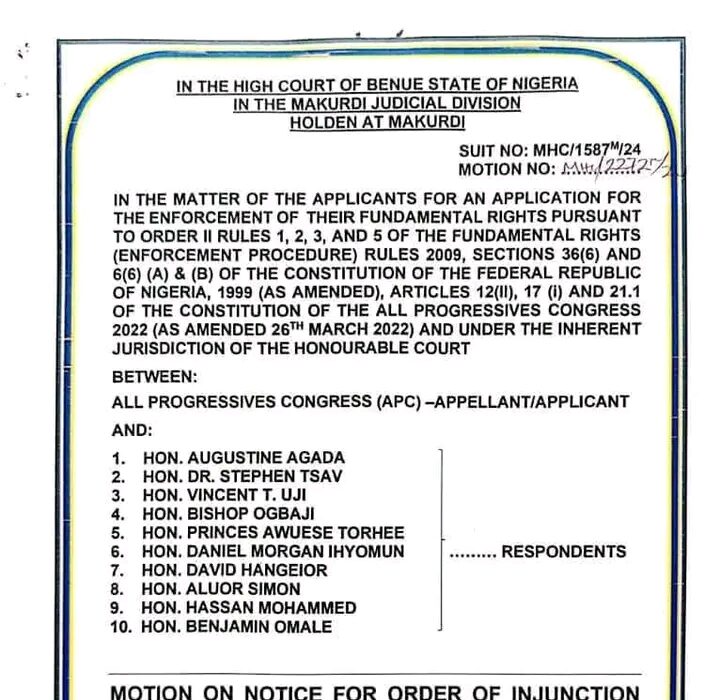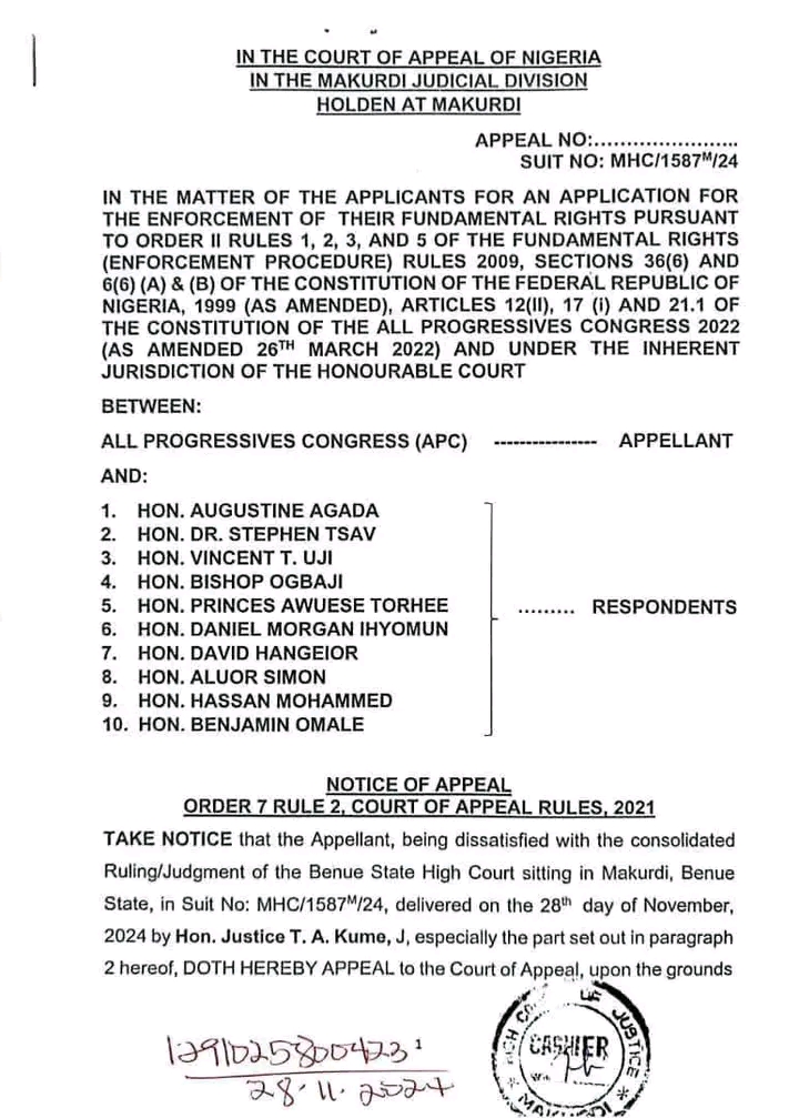 The development follows a November 28, 2024 judgment of the Makurdi High Court in Suit No: MHC/1587M/2024, which had reportedly favoured Agada and his executive committee. In response, the APC promptly filed an appeal against the ruling on the same day—November 28, 2024—and sought urgent interlocutory reliefs to preserve the status quo pending the determination of the substantive appeal.