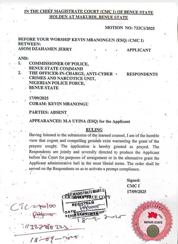 According to a press release signed by Daniel Ihomun, State Publicity Secretary of APC Benue State, the situation escalated when the Chief Magistrate Court I ordered Jerry’s arraignment or release on liberal bail terms on September 17, 2025. Shockingly, the police have defied this court order, further exacerbating the abuse of Jerry’s rights and undermining the judiciary.