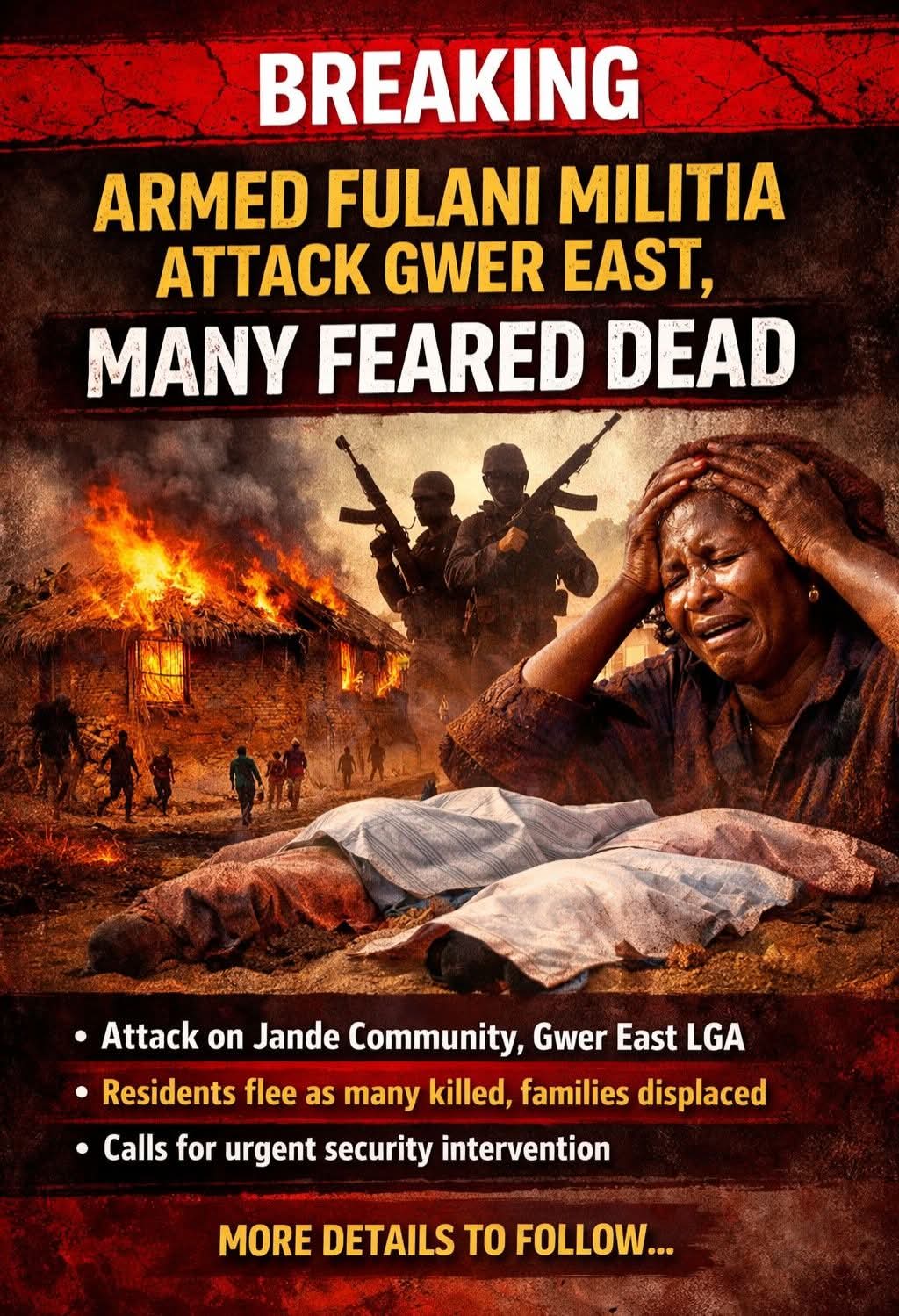 Multiple local sources have reported a deadly attack by armed Fulani militia on the Jande (also known as Agena) community in Mbalom, Gwer East Local Government Area of Benue State, with many residents feared dead.