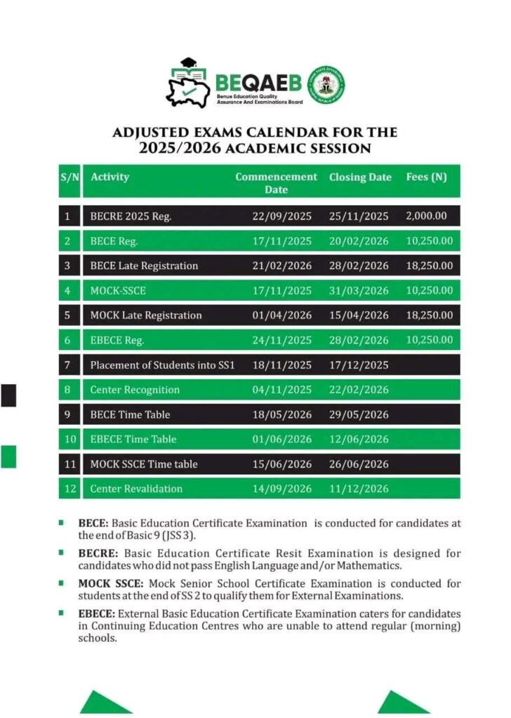 The Benue State Education Quality Assurance and Examinations Board (BEQAEB) has announced that early registration for the 2026 Basic Education Certificate Examination (BECE/FSLC) will close on Friday, February 20, 2026.