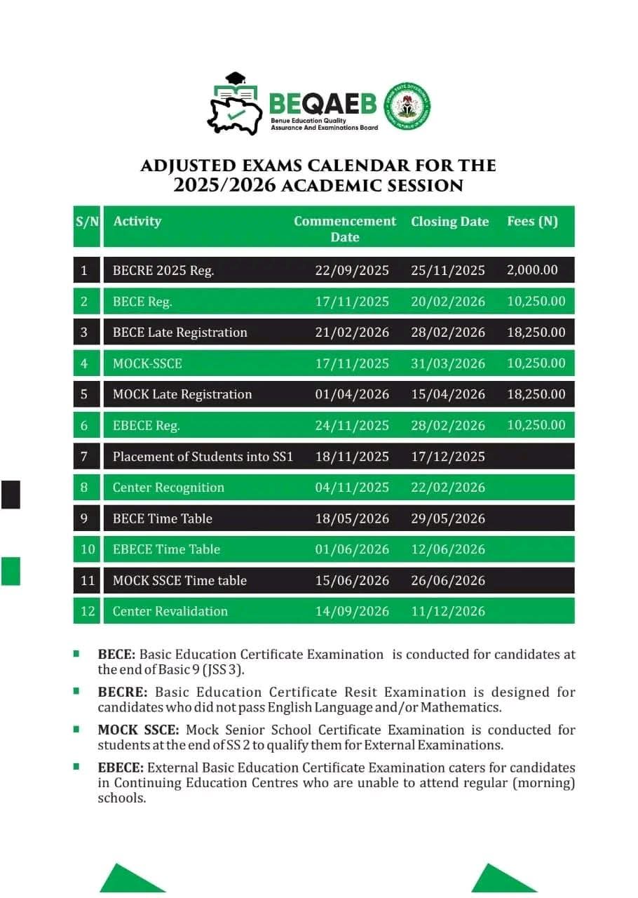 The Benue State Education Quality Assurance and Examinations Board (BEQAEB) has announced that early registration for the 2026 Basic Education Certificate Examination (BECE/FSLC) will close on Friday, February 20, 2026.