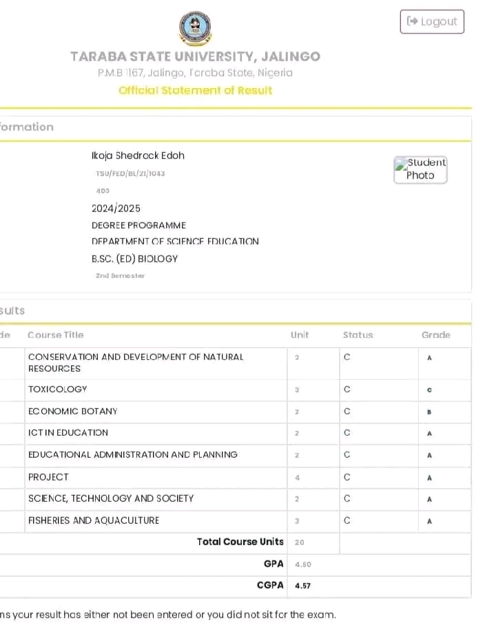A proud moment for the people of Benue State has emerged with the outstanding academic success of one of its sons. Ikoja Shedrack Edoh, hailing from Alokpa in Olegochepo, Agatu Local Government Area, has graduated with a First Class honours degree in B.Sc. (Ed) Biology from Taraba State University, Jalingo.