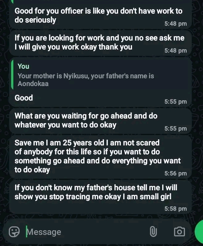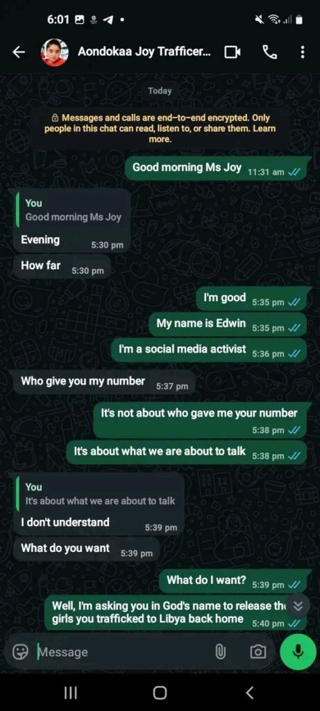 “I reached out to Madam Joy Aondokaa begging her to release the 14 girls she trafficked to Libya back to Nigeria (Benue), but you can see her reply… very bad,” the elder wrote, hinting at a hostile or dismissive response from the accused.