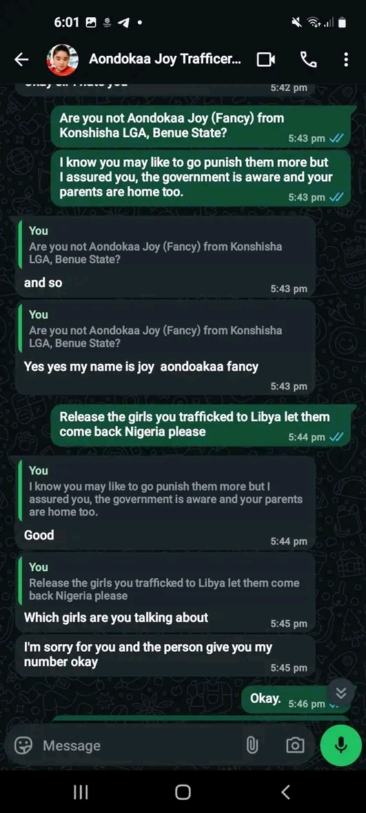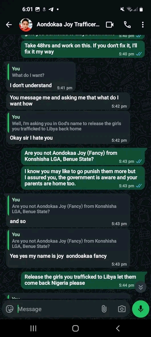 “I reached out to Madam Joy Aondokaa begging her to release the 14 girls she trafficked to Libya back to Nigeria (Benue), but you can see her reply… very bad,” the elder wrote, hinting at a hostile or dismissive response from the accused.