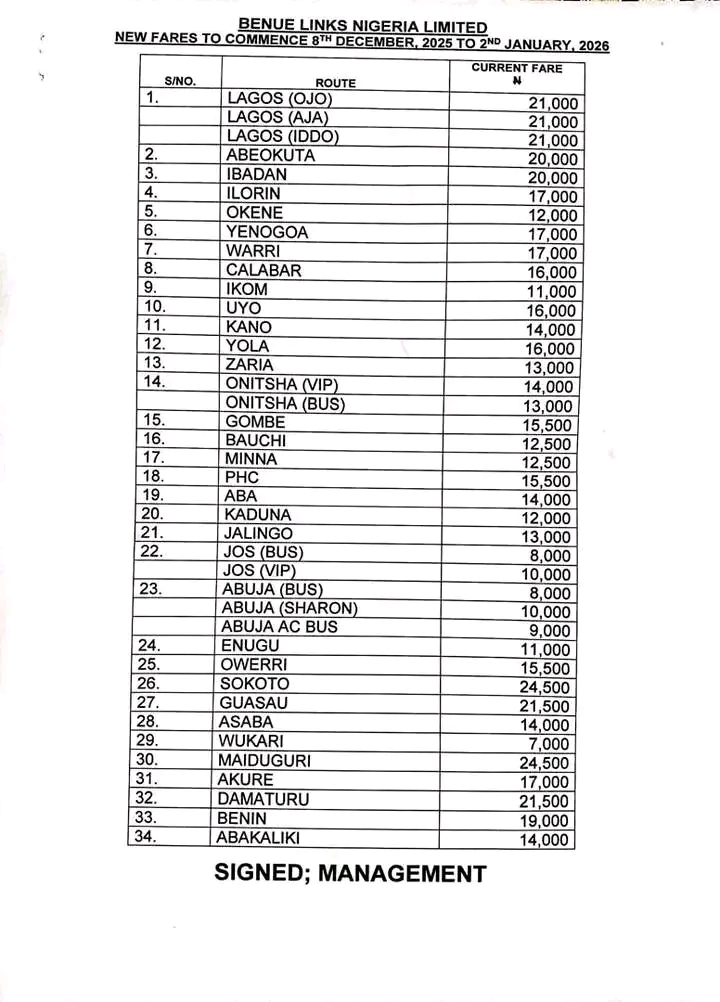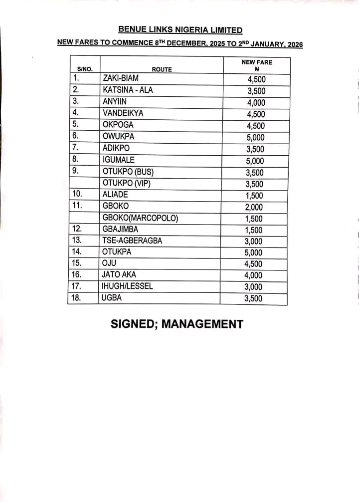 According to the management, the fare reduction is deliberately timed to ease the economic burden on families, reduce the usual December fare hike by commercial operators, and allow passengers to redirect savings toward other pressing holiday needs. Benue Links emphasized that “even a small reduction can help families channel funds to other seasonal needs,” a statement that has resonated strongly with commuters already feeling the pinch of rising living costs.
