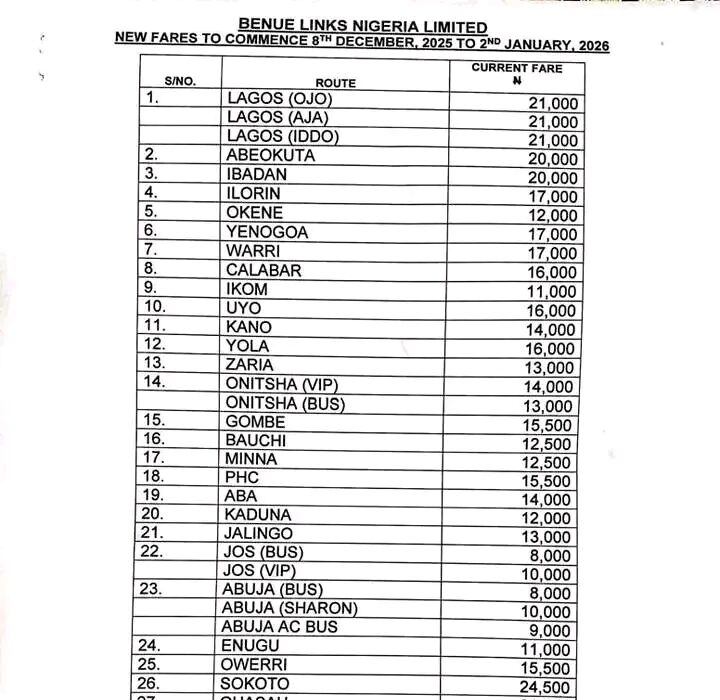 In a move that has brought instant relief to thousands of travelers in Benue State and beyond, Benue Links Nigeria Limited has officially launched its 2025 Christmas Transport Fare Reduction Bonanza, effective from today, Monday, December 8, 2025.