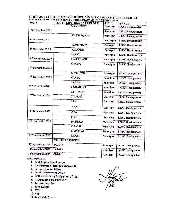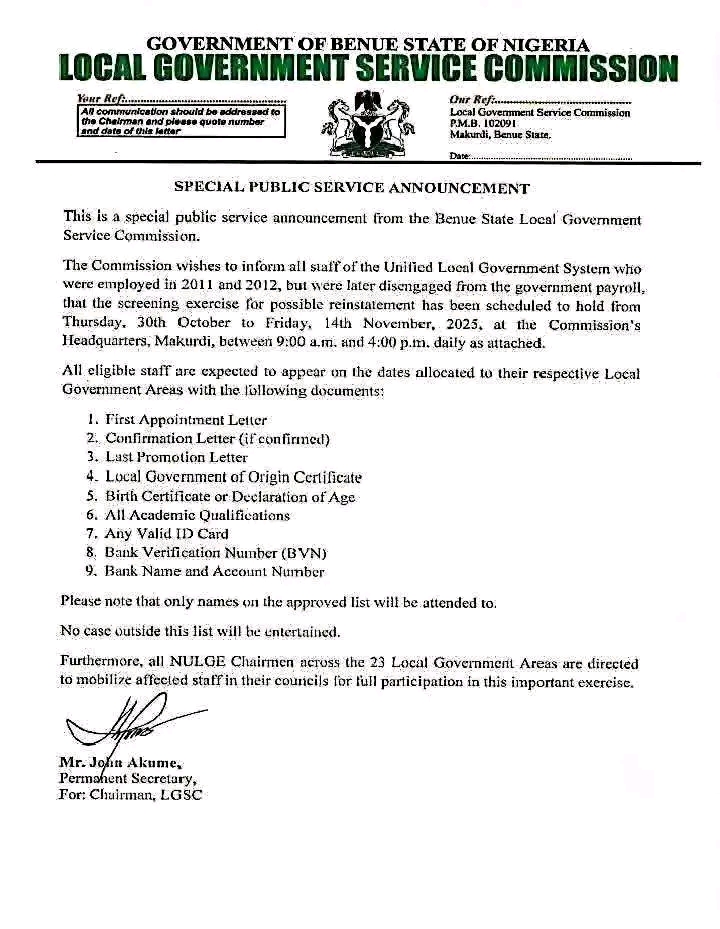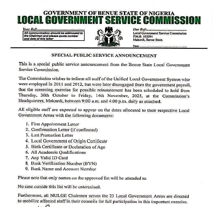 Now, under the administration of Governor Rev. Fr. Hyacinth Alia, the state government has initiated a verification and reinstatement process to right the wrongs of the past. According to the official notice from the Benue State Local Government Service Commission, all individuals affected by the 2011/2012 purge are required to appear in person for data capture and document validation.