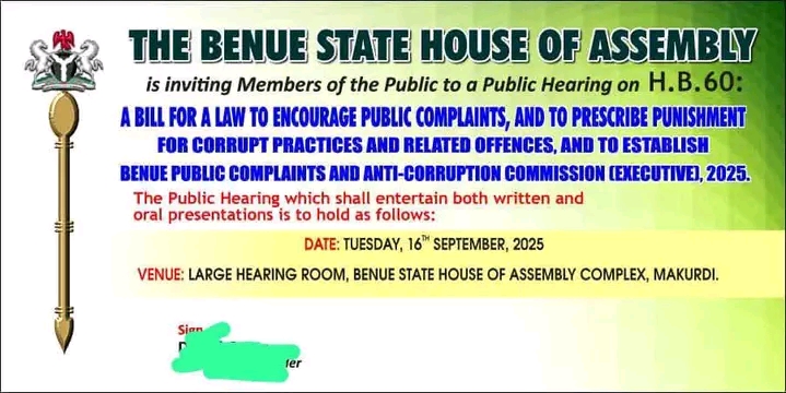 The Benue State House of Assembly took a significant step toward combating corruption on Tuesday, 16th September 2025, by holding a public hearing on a landmark bill aimed at encouraging public complaints, prescribing punishment for corrupt practices, and establishing the Benue Public Complaints and Anti-Corruption Commission in Makurdi, the state capital.