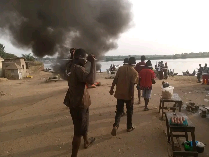 Thick black smoke and burning tyres greeted the dawn at Buruku river crossing this morning as hundreds of angry maritime workers and boat operators and members of the Tombo Marine Time Workers Union of Nigeria shut down the strategic waterway in protest.