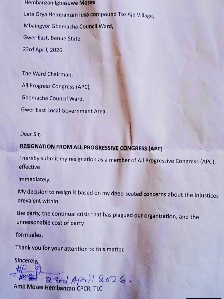 The crisis within the Governor Hyacinth Alia faction of the All Progressives Congress (APC) in Benue State has deepened as another aspirant for the Benue State House of Assembly, Amb. Moses Hembanzan, has resigned from the party.