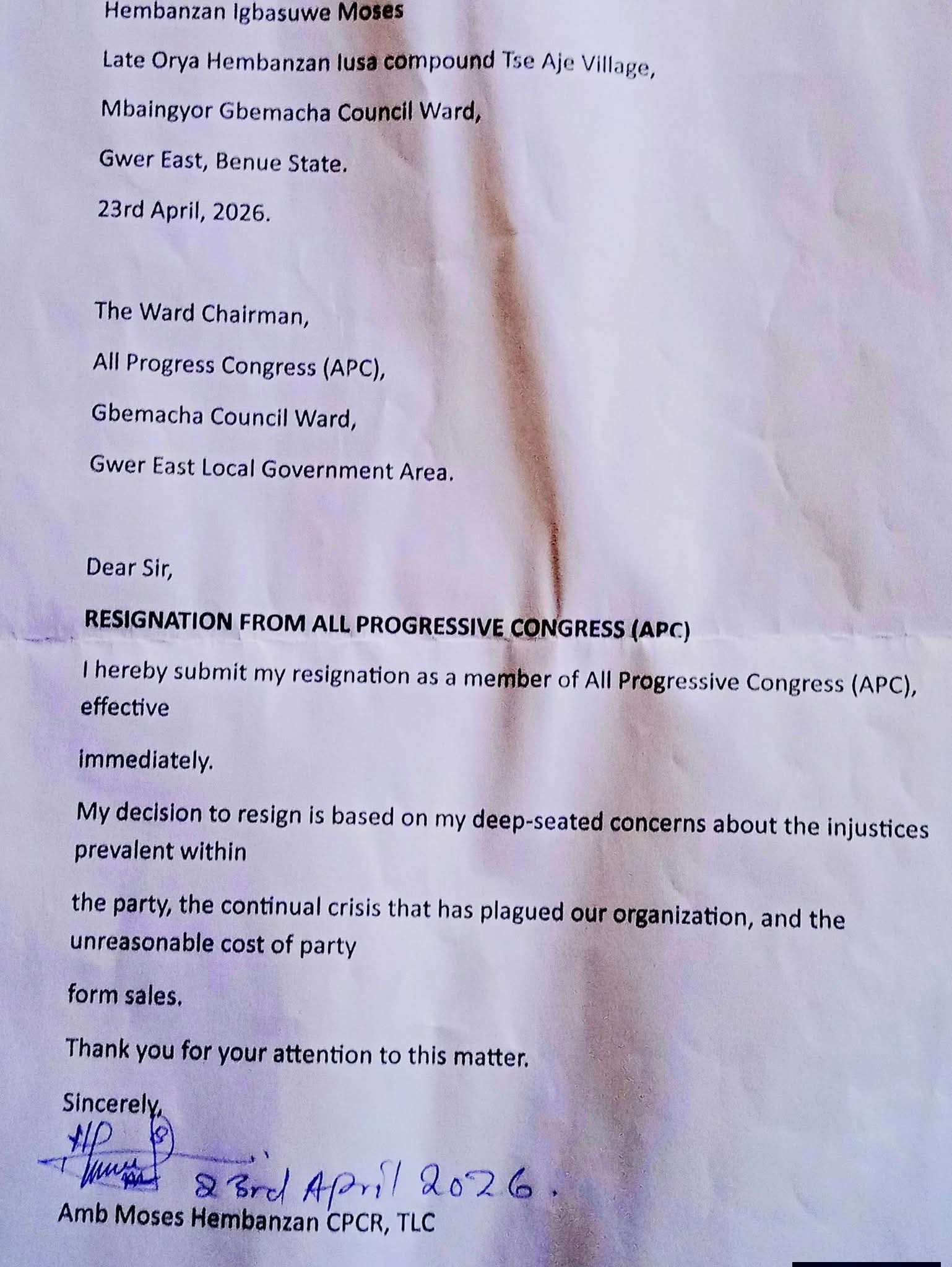 Hembanzan, who was contesting for the Gwer East Constituency seat, cited injustice, internal challenges, and high cost of nomination forms as major reasons for his exit. In his resignation statement, he lamented that the exorbitant cost of forms has shut out many youths from participating in politics, describing the situation as one that encourages inequality and political godfatherism.