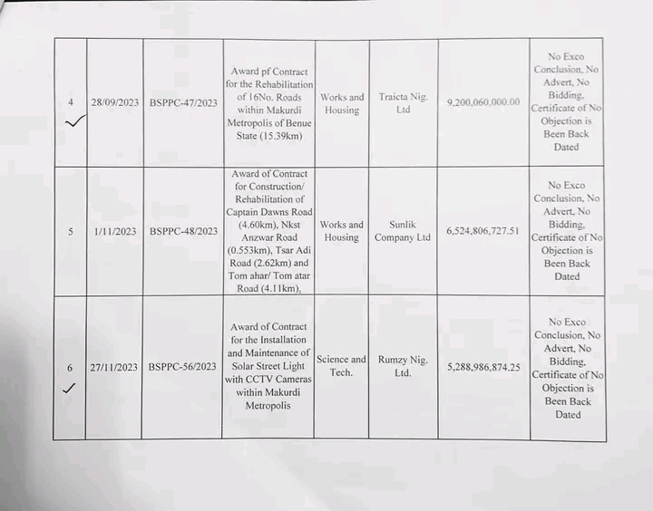 – BSPPC-47/2023, dated September 28, 2023: Rehabilitation of 16 roads within Makurdi Metropolis (15.39km) by Traicta Nigeria Ltd through the Ministry of Works and Housing, valued at ₦9.2 billion. Observations note no EXCO conclusion, no advertisement, no competitive bidding, and a back-dated Certificate of No Objection.
