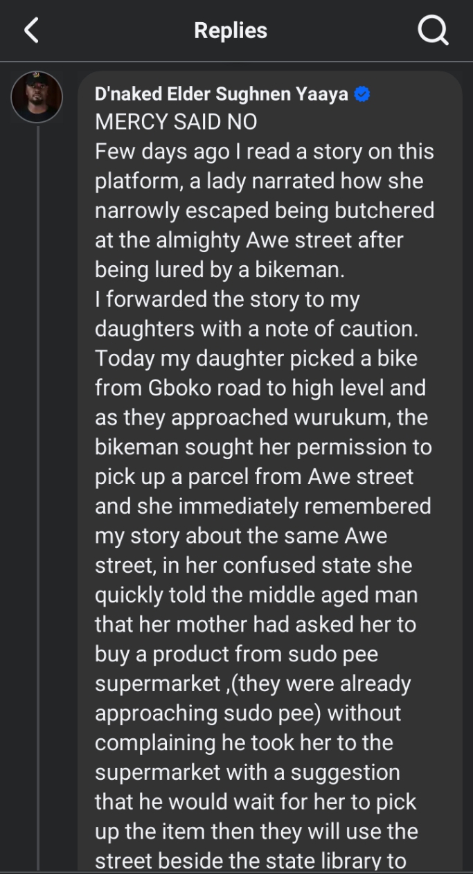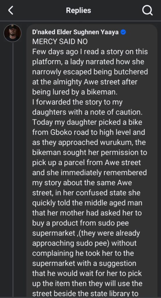 In a widely shared Facebook post by user D’nkaked Elder Sugnhnen Yaaya, the woman’s father recounted how his daughter, while riding an okada (commercial motorcycle) from Gboko Road to High Level, encountered a middle-aged rider who requested permission to branch to Awe Street to supposedly pick up a parcel.