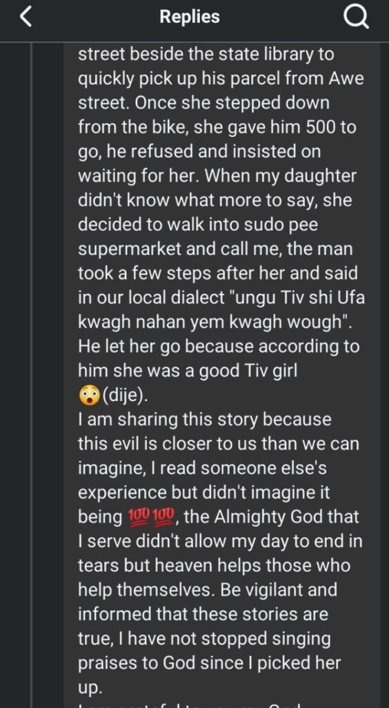Unsettled, the young woman entered the supermarket, called her father, and explained the situation. The rider followed her a few steps inside before speaking to her in the Tiv language: “Ungu Tiv shi Ufa kwagha nahan yem kwagha wough,” which loosely translates to a remark acknowledging her as a “good Tiv girl.” He then allowed her to leave unharmed.