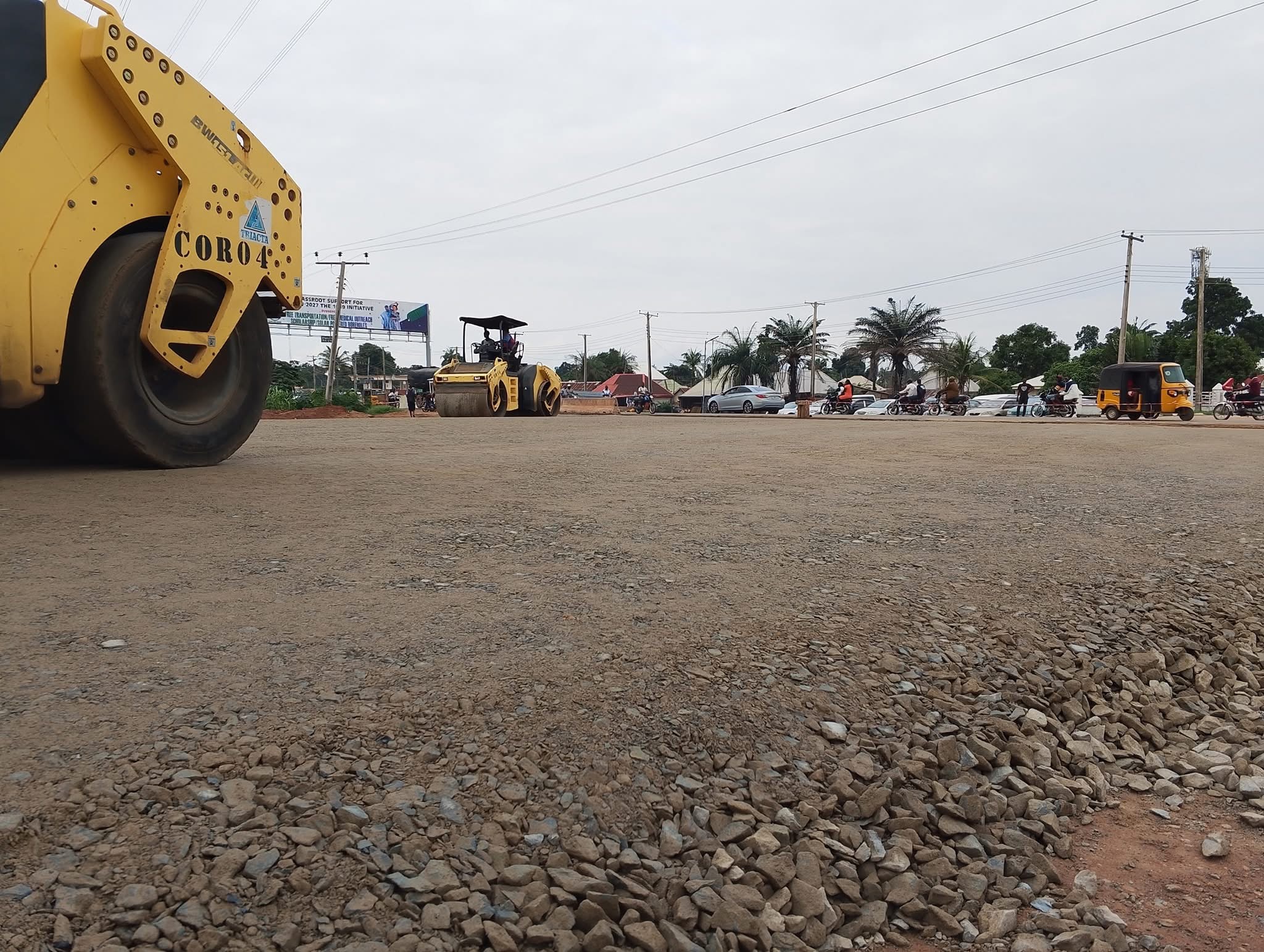 The pictorial evidence from the site showcases heavy machinery, including road rollers, actively compacting the stone base across multiple sections of the road. The images reveal a well-coordinated effort to lay a solid foundation, with workers and equipment visible amidst piles of stones and leveled ground. Governor Alia’s administration has emphasized high-quality standards, aiming to deliver a robust infrastructure that will serve the community for years to come.