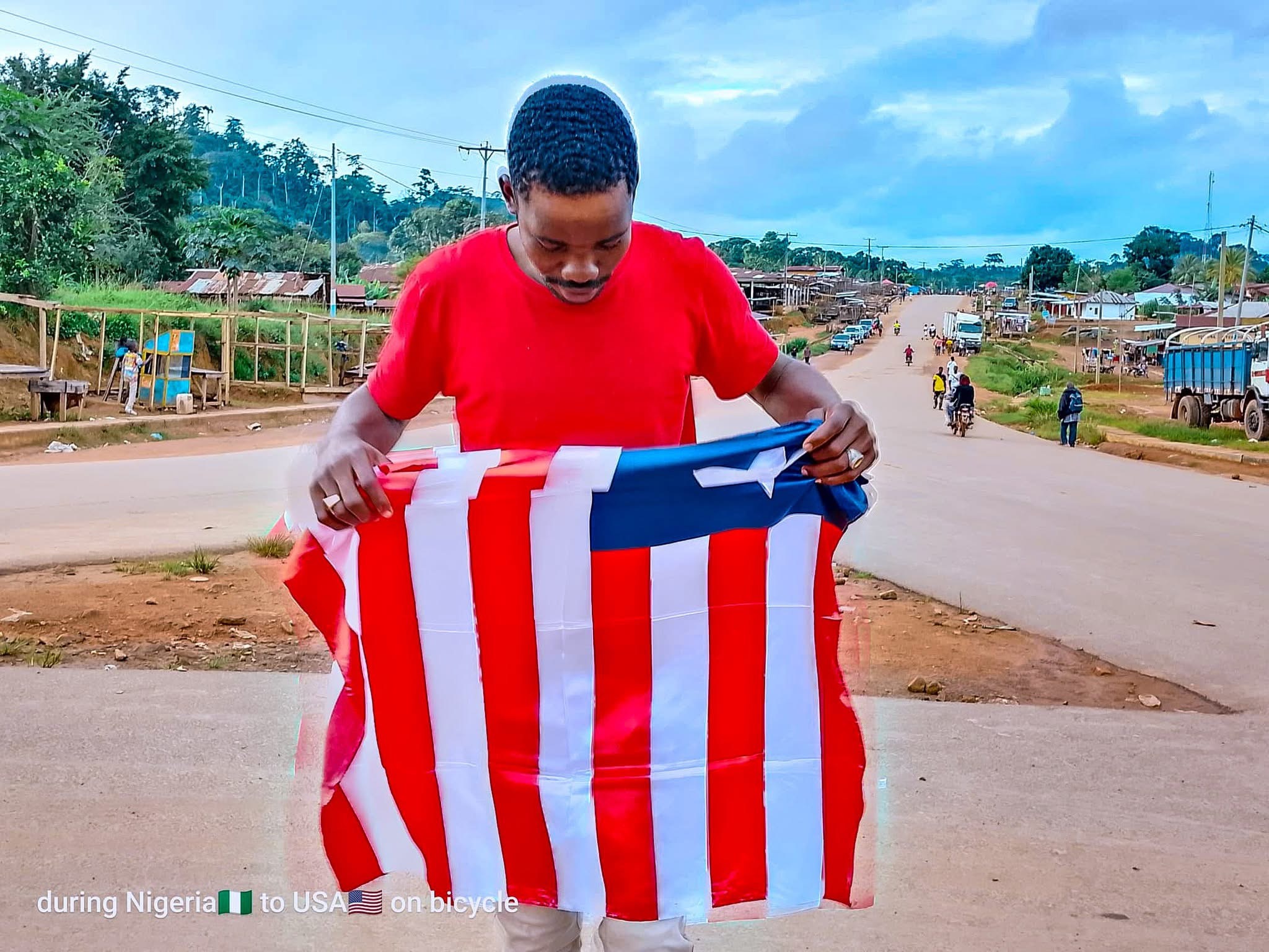 Emmywuks, who began his ambitious ride to raise awareness and support for internally displaced persons (IDPs) and orphaned children across Africa, was seen proudly holding the Liberian flag in several photos. The images capture him standing on a dusty road, waving the flag with pride alongside the American flag, symbolizing his ultimate destination. “Each swollen leg is a symbol of the resilience we share as Africans,” he added, emphasizing the unity and strength found in the continent’s struggles and triumphs.