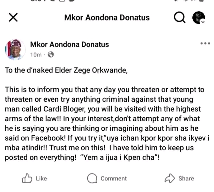 “To the d’naked Elder Zege Orkwande,” Aondona wrote on November 3, 2025, “this is to inform you that any day you threaten or attempt to threaten or even try anything criminal against that young man called Cardi Blogger, you will be visited with the highest arms of the law.” He didn’t stop there. Aondona claimed he’d already instructed the blogger to keep him posted on any developments, closing with a sharp Tiv jab: “Yem a ijua i Kpen cha!”—a phrase that roughly translates to a defiant “we’re ready for whatever comes.”