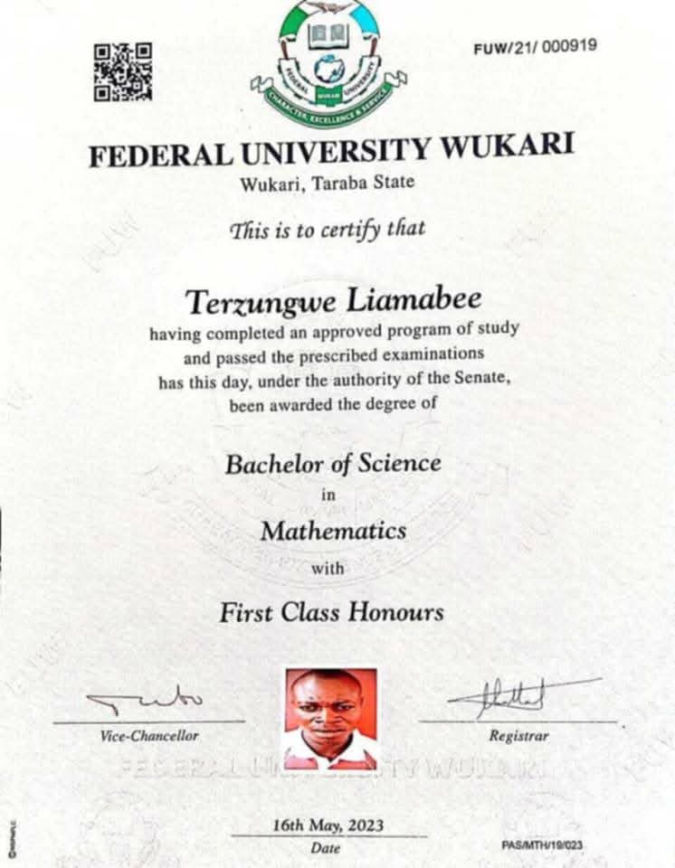 Liamabee’s academic credentials are impressive, as evidenced by the certificate from Federal University Wukari, which confirms his completion of an approved program of study. Yet, like many graduates, he now faces an uncertain future, prompting calls for better motivation and opportunities for high-achieving students.