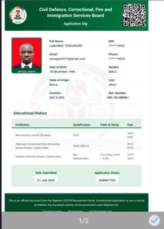 A recent post on X has brought attention to the plight of Terzungwe Liamabee, a first-class graduate of Mathematics from Federal University Wukari, Taraba State. Despite his academic excellence, Liamabee finds himself jobless and is now seeking opportunities with the Nigeria Customs Service, a move that highlights the growing challenges faced by highly qualified graduates in Nigeria.
