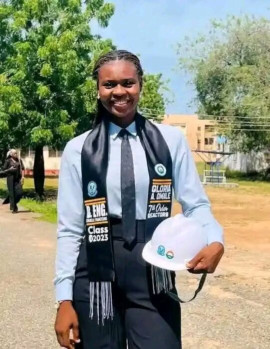 Picture this: a poised Gloria, draped in her graduation regalia—a crisp light blue shirt, black sash, and tie—holding a hard hat emblazoned with the university’s emblem, her braided hair framing a radiant smile against the backdrop of lush green trees and a clear Bauchi sky. The photo, shared widely on social media, captures the essence of triumph: her name boldly inscribed on the sash as “7th Order Chemical Reactors” nods to her specialized prowess, while the hard hat symbolizes the practical engineering spirit she embodies. It’s more than a snapshot; it’s a testament to years of late nights, rigorous experiments, and unyielding determination in a field that demands precision and innovation.
