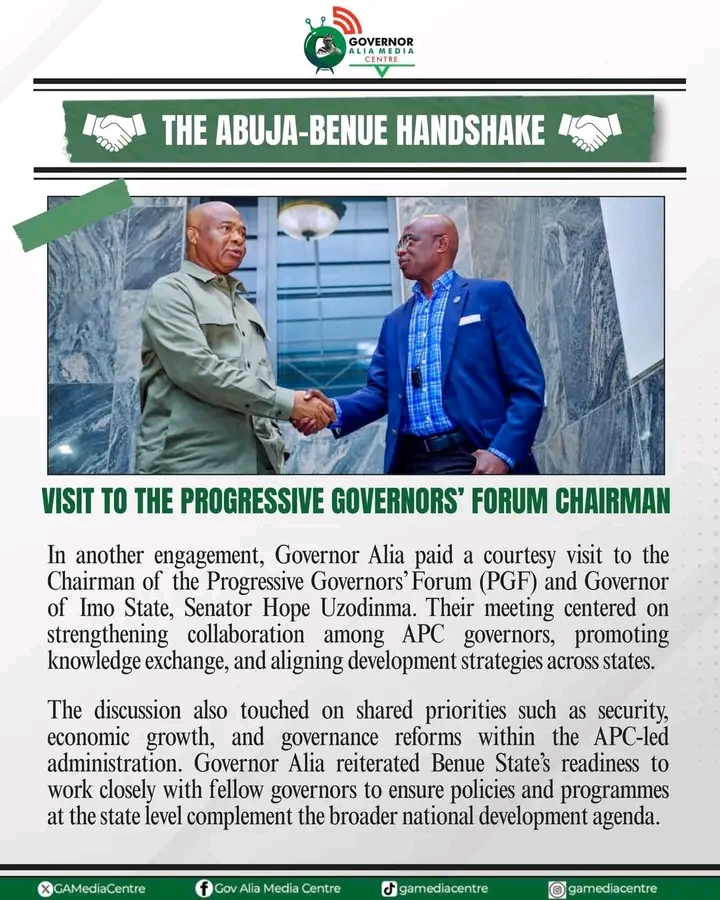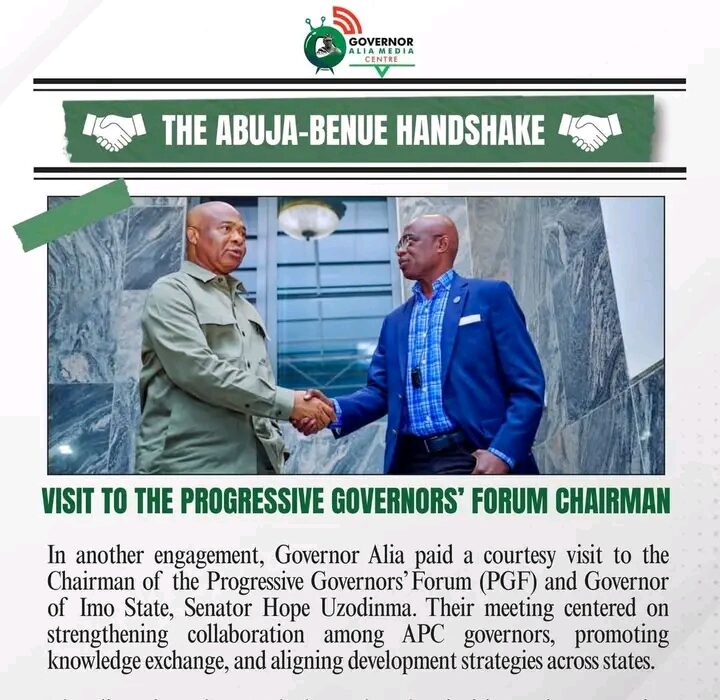 In another engagement, Governor Alia paid a courtesy visit to the Chairman of the Progressive Governors’ Forum (PGF) and Governor of Imo State, Senator Hope Uzodimma. Their meeting centered on strengthening collaboration among APC governors, promoting knowledge exchange, and aligning development strategies across states. The discussion also touched on shared priorities such as security, economic growth, and governance reforms within the APC-led administration. Governor Alia reiterated Benue State’s readiness to work closely with fellow governors to ensure policies and programs at the state level complement the broader national development agenda.