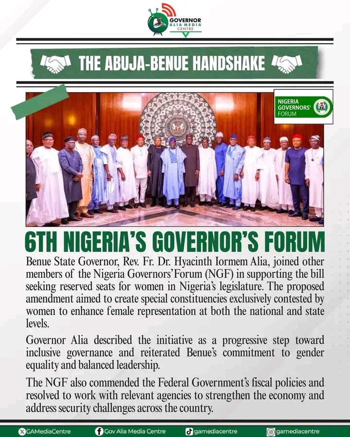 Governor Alia’s engagements also showcased his dedication to governance reforms and inclusive representation. At the 6th Nigeria Governors’ Forum (NGF), he joined other NGF members in supporting a bill seeking reserved seats for women in Nigeria’s legislature. The proposed amendment aims to create special constituencies exclusively contested by women to enhance female representation at both national and state levels. Describing the initiative as a progressive step toward inclusive governance, Governor Alia reiterated Benue’s commitment to gender equality and balanced leadership. The NGF also commended the Federal Government’s fiscal policies and resolved to work with relevant agencies to strengthen the economy and address security challenges across the country.