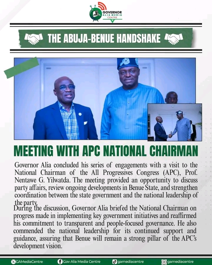 The governor concluded his series of engagements with a visit to the National Chairman of the All Progressives Congress (APC), Prof. Nentawe G. Yilwatda. The meeting provided an opportunity to discuss party affairs, review ongoing developments in Benue State, and strengthen coordination between the state government and the national leadership of the party. During the discussion, Governor Alia briefed the National Chairman on progress made in implementing key government initiatives and reaffirmed his commitment to transparent and people-focused governance. He also assured that Benue will remain a strong pillar of the APC’s development vision.