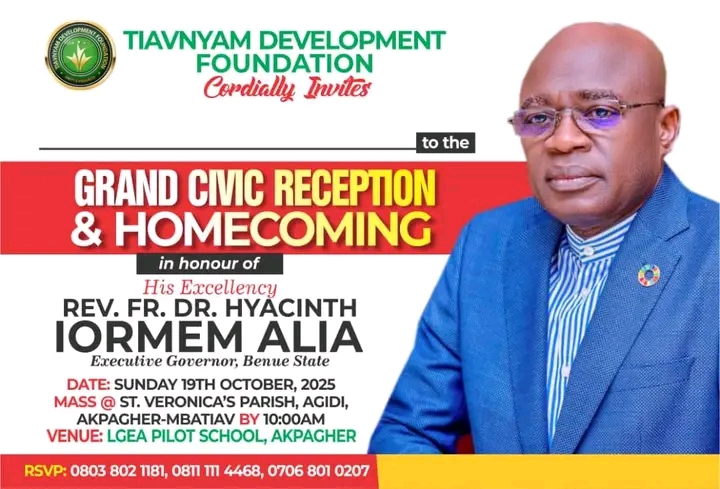 The Tiavnyam Development Foundation has announced a special event to celebrate the achievements of His Excellency Rev. Fr. Dr. Hyacinth Iormem Alia, the Executive Governor of Benue State. A grand civic reception and homecoming ceremony is scheduled to take place tomorrow, Sunday, October 19, 2025, in honor of the governor’s exemplary leadership.