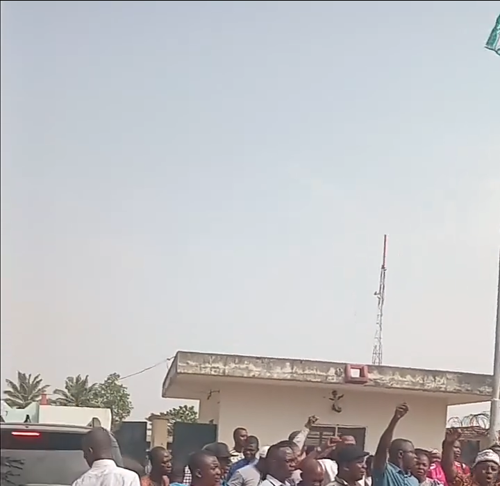The action, captured in a viral video circulating on social media, shows a group of protesters gathered outside the station’s entrance, voicing their grievances amid growing frustration over labor conditions. The protest highlights ongoing issues in Benue State’s public sector, where workers have repeatedly called for the enforcement of the N75,000 minimum wage approved by Governor Hyacinth Alia in late 2024.