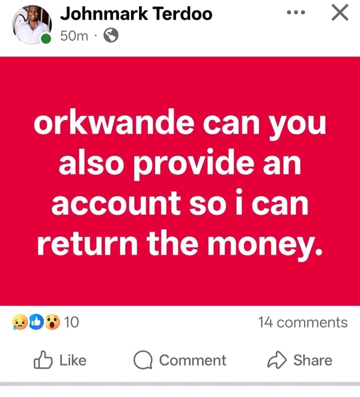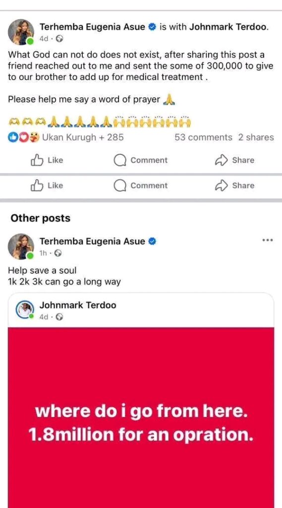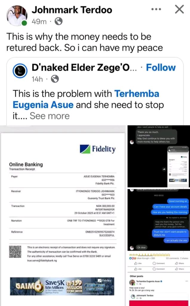 Orkwarde isn’t backing down, teasing receipts of donations to John Mark and others to bolster the claims. The post urges transparency: “This is the problem with Terhemba Eugenia Asue and she need to stop it.” It’s a call to action in a space where crowdfunding has become a lifeline for many in Benue, but trust is fragile.