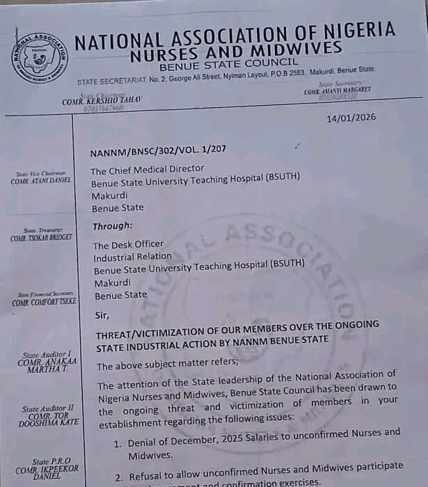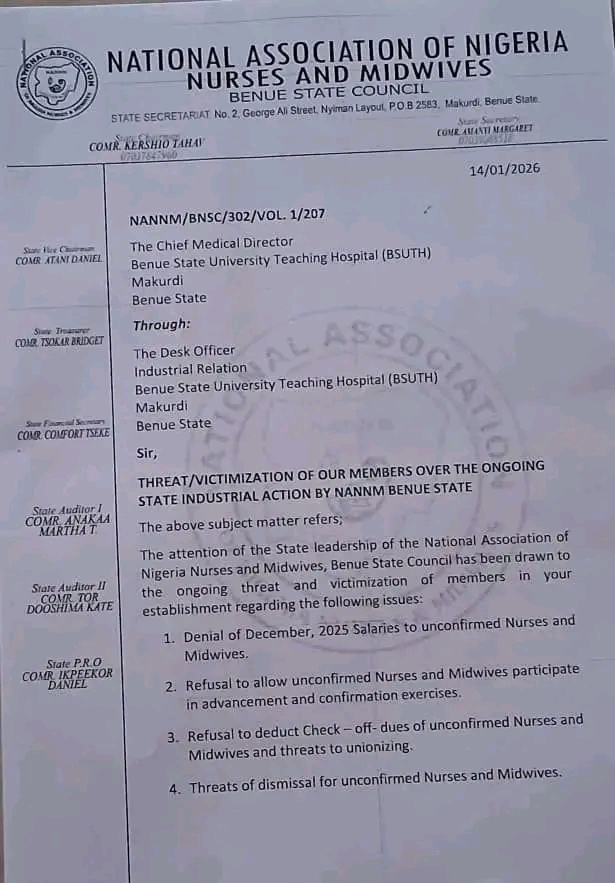 The Benue State chapter of the National Association of Nigeria Nurses and Midwives (NANNM) has issued a strong warning that ongoing alleged victimisation and punitive measures against nurses at the Benue State University Teaching Hospital (BSUTH), Makurdi, risk further prolonging the current industrial action and escalating the crisis.