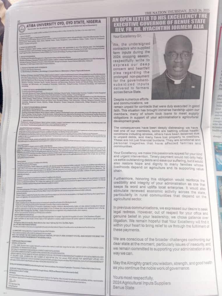 “Asom D Jerry,” the writer behind the post on Facebook, highlights a troubling disparity. “While investment in agriculture is crucial, stakeholders are questioning why Governor Hyacinth Alia is prioritizing advance payment for 2025 suppliers while contractors who provided farm inputs during the 2024 cropping season remain unpaid.”