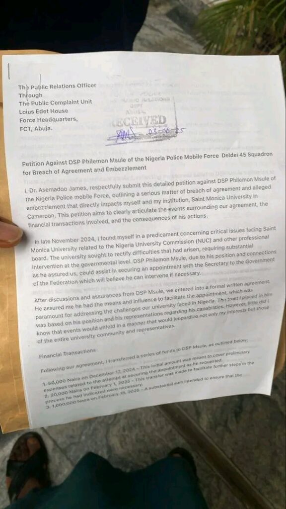 A serving senior officer of the Nigeria Police Force, now Superintendent of Police (SP) Philemon T. Msule, has been publicly accused of repeatedly defrauding innocent Nigerians through false promises of job placements, with the alleged pattern dating back to 2018 and continuing even after his transfer from Benue State to Abuja.