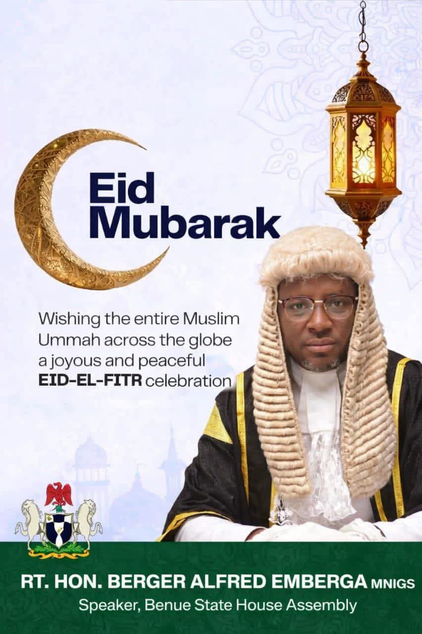 The Speaker of the Benue State House of Assembly, Rt. Hon. Berger Alfred Emberga, has extended warm felicitations to the Muslim faithful in Benue State and across Nigeria on the joyous occasion of Eid-el-Fitr.