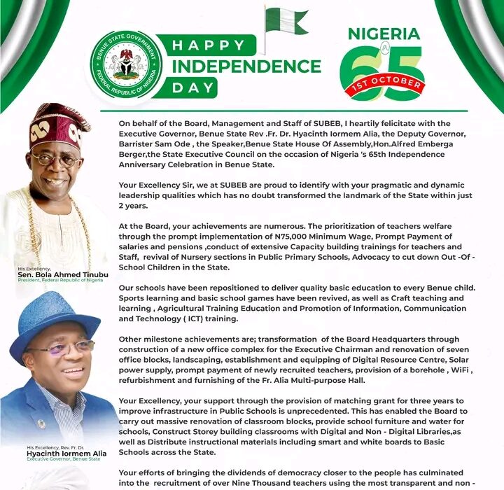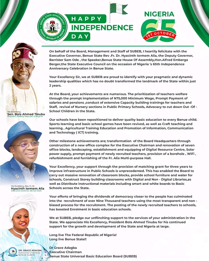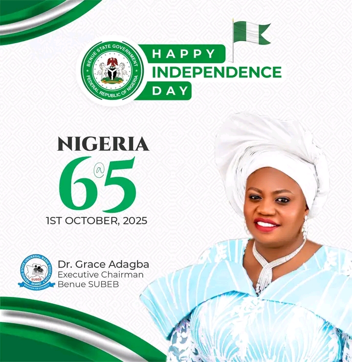 On the occasion of Nigeria’s 65th Independence Anniversary, the Benue State Universal Basic Education Board (SUBEB) has reaffirmed its dedication to enhancing education across the state. Dr. Grace Adagba, Executive Chairman of SUBEB, congratulated Governor Rev. Fr. Dr. Hyacinth Alia, Deputy Governor Barrister Sam Ode, the Speaker of the Benue State House of Assembly, Hon. Alfred Emberga Berger, and the State Executive Council, highlighting the transformative impact of their leadership.