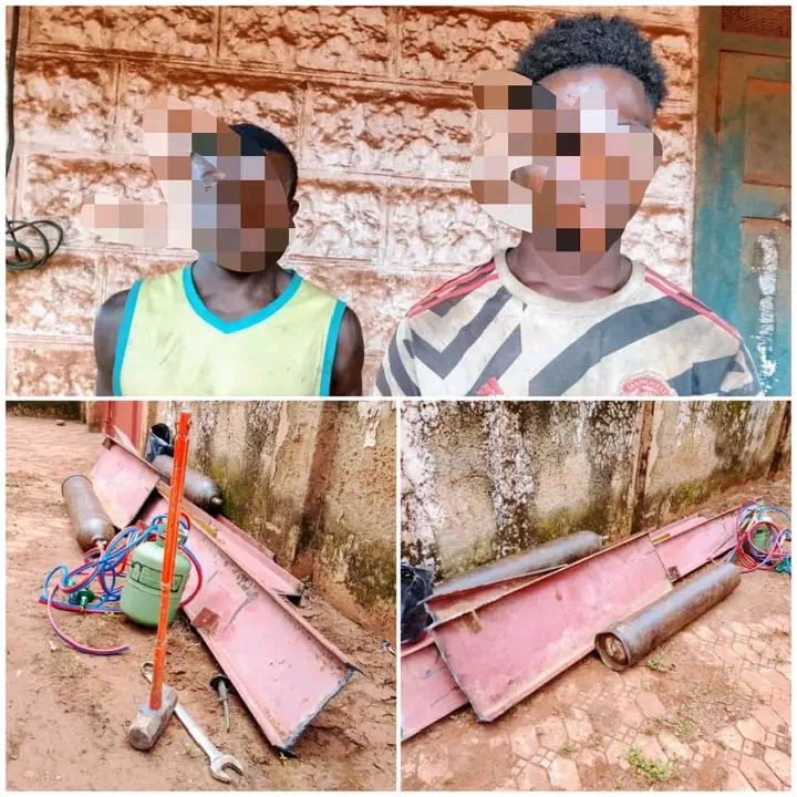 The suspects, identified as Wilson Egbanga (16) and Okoh Akoja (40), both residents of Otukpo Local Government Area (LGA), were caught in the act with equipment and tools suspected to be used for cutting metal. Items recovered at the scene included several cut sheets of heavy metal, a massive mallet, spanners, two large gas cylinders, and a smaller gas cylinder attached with hoses, highlighting the scale of the intended theft.