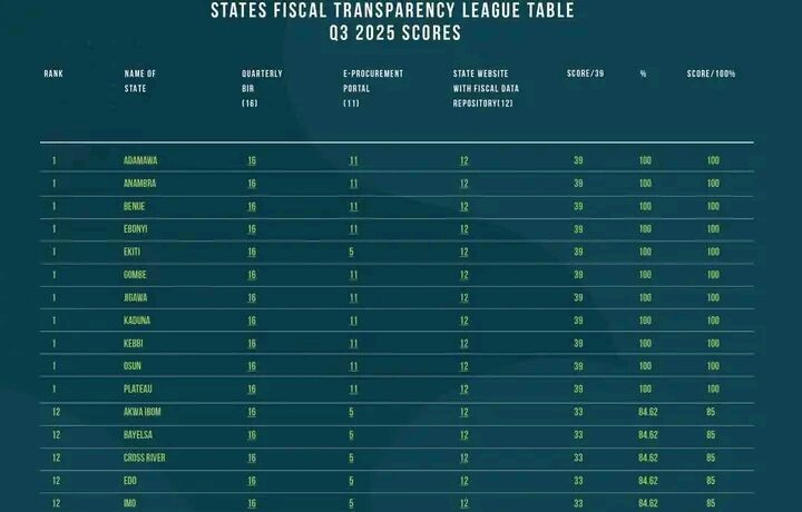 Benue Tops BudgIT’s Q3 2025 States Fiscal Transparency League Table
