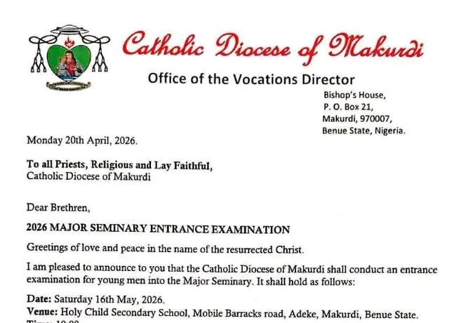 The Catholic Diocese of Makurdi has announced that it will conduct an entrance examination for young men seeking admission into the Major Seminary. The examination is scheduled to take place on Saturday, 16th May, 2026, at Holy Child Secondary School...