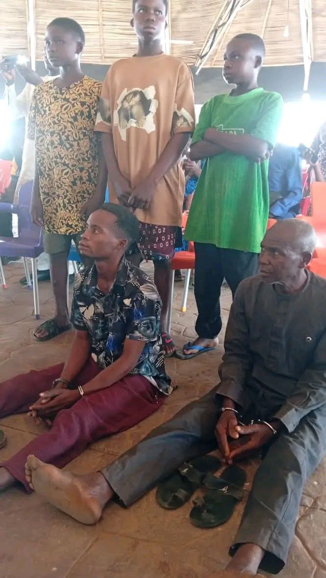 The suspects were brought before a gathering at a public venue where community members, traditional leaders, and onlookers witnessed the parade. Images circulating from the event show the accused individuals seated on the ground, some appearing distressed, while surrounded by a crowd including youths and elders dressed in various traditional and casual attire.