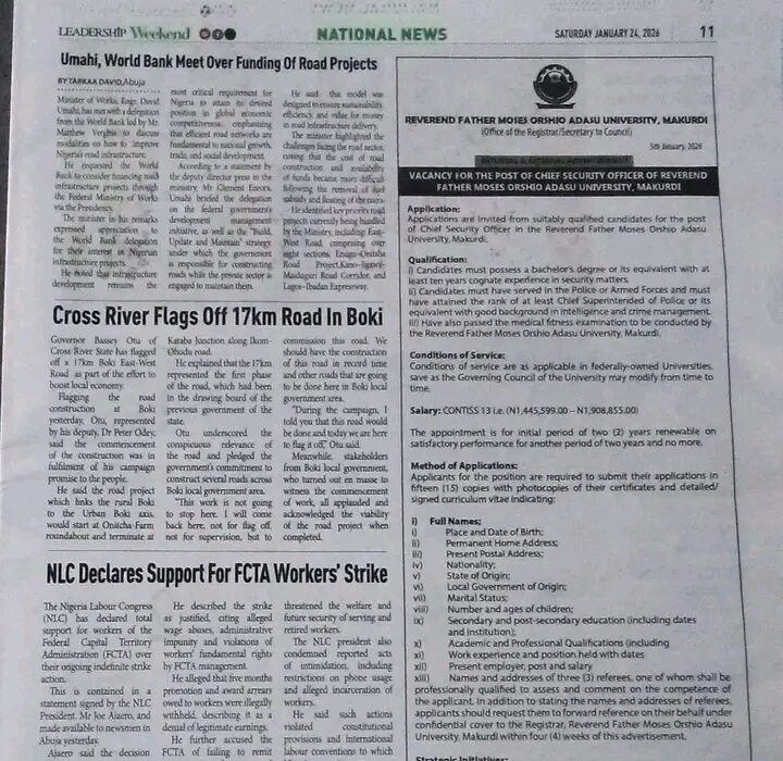 Rev. Fr. Moses Orshio Adasu University, Makurdi, has announced a vacancy for the position of Chief Security Officer in a public advertisement released on January 26, 2026.
