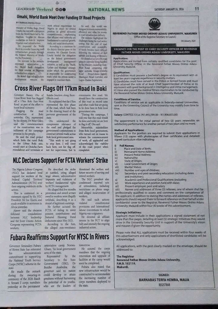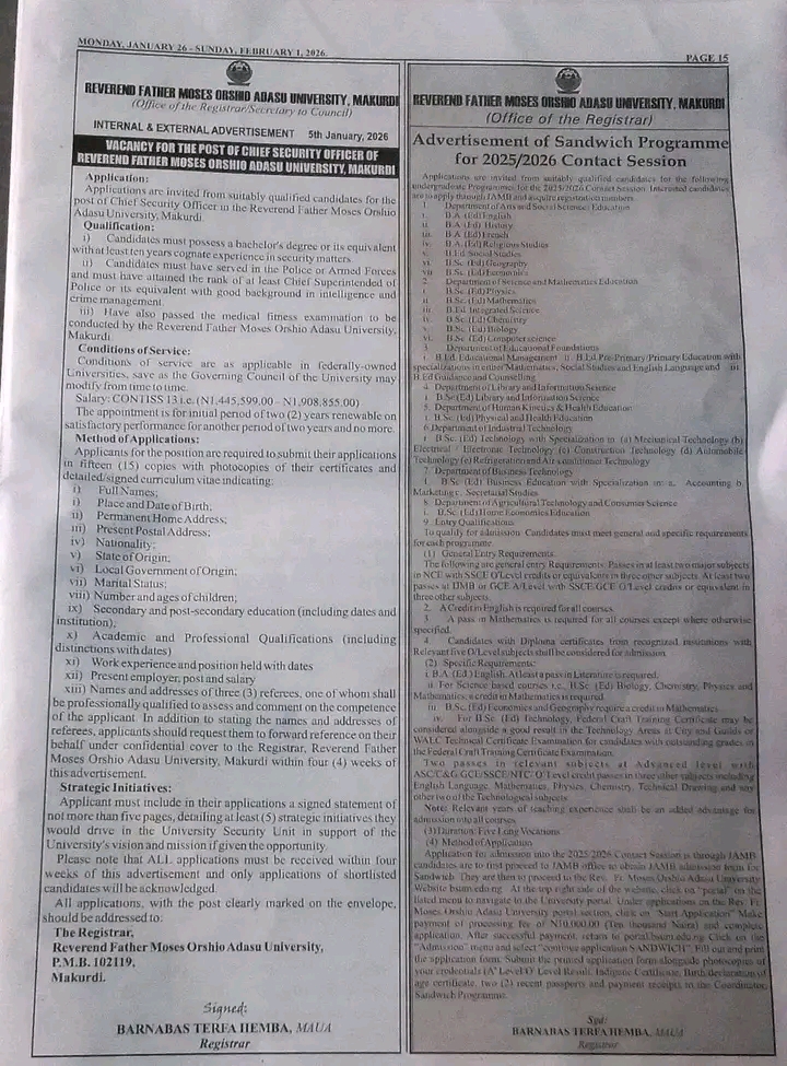 Rev. Fr. Moses Orshio Adasu University, a relatively young but growing tertiary institution in Benue State, continues to expand its administrative and academic infrastructure. The recruitment for this critical security position is seen as part of efforts to strengthen campus safety amid increasing concerns over security in educational environments across Nigeria.