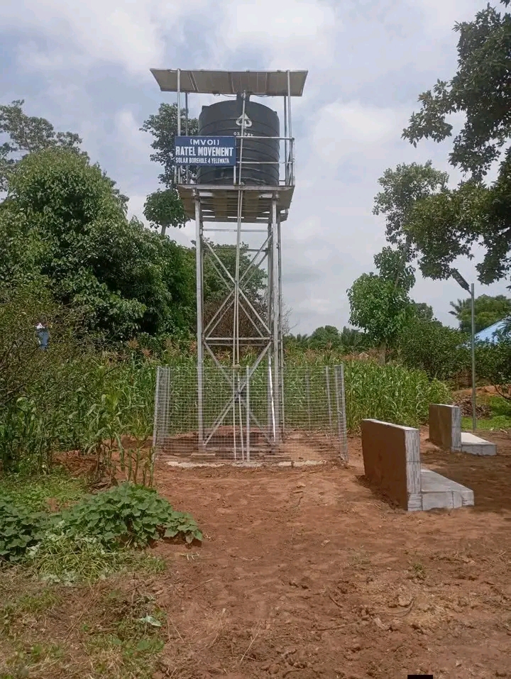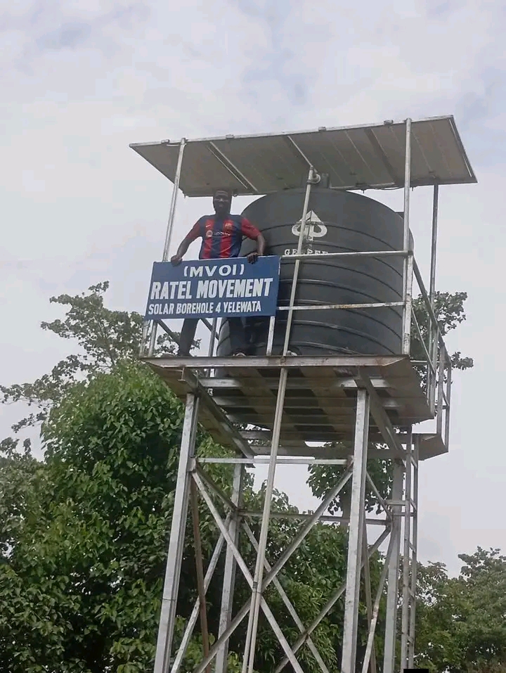 Social media posts circulating on Facebook show the completed project, including images of a tall water tank tower fitted with solar panels, elevated platform, and signage reading “(IMVOI) RATEL MOVEMENT SOLAR BOREHOLE 4 YELEWATA.” Several individuals, including supporters associated with the RATEL MOVEMENT, are seen posing proudly atop the structure.